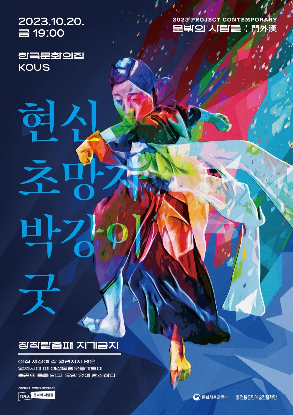 전통공연예술진흥재단(이사장 김삼진)이 2023 프로젝트 컨템퍼러리 ‘문밖의 사람들 : 門外漢’ 공연을 개최한다. ‘문밖의 사람들 : 門外漢’은 전통예술의 경계를 오가며 활동하는 다양한 아티스트를 통해 새롭게 해석된 동시대 전통공연예술을 선보이고 있다. 올해는 2022년 기획안 공모를 통해 선정된 2개의 공연을 10월과 11월에 걸쳐 선보인다.