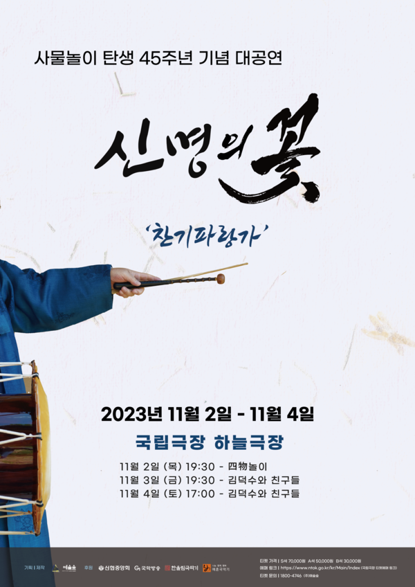 올해로 사물놀이가 탄생한 지 45년, 그 역사의 주역이자 평생을 우리의 신명과 장단으로 세계속에 한국 음악의 새로운 역사를 써온 김덕수 명인이 오는 11월 2일, 3일, 4일 국립극장 하늘극장에서 그의 음악적 동지들과 함께 ‘신명의 꽃’을 피워낸다.