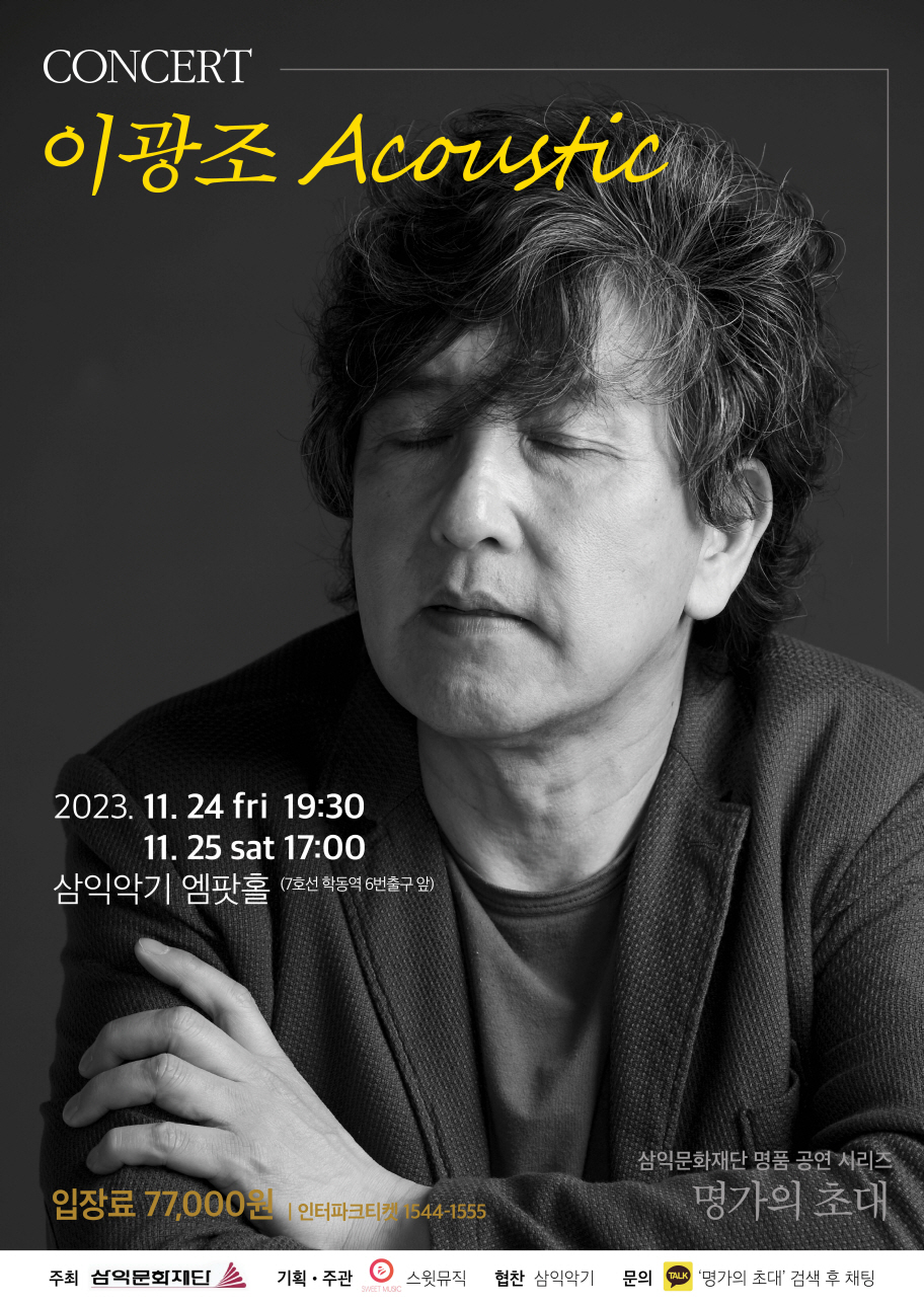 이번 공연의 타이틀은 ‘이광조 어쿠스틱’이다. 이광조만의 서정적이고 감성적인 노래들을 순수하면서도 세련된 사운드에 담아 표현한다.