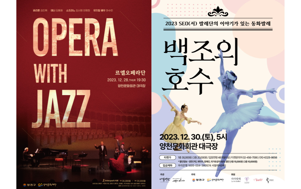 ‘Opera With Jazz’, ‘이야기가 있는 동화발레 백조의 호수’ 두 공연 모두 12월 초부터 예매가 진행 중이다. ‘Opera With Jazz’는 인터파크를 통해 예매 가능하며, 자세한 사항은 양천문화재단 홈페이지(https://yfac.kr/main)를 통해 확인할 수 있다. ‘이야기가 있는 동화발레 백조의 호수’는 서(SEO)발레단 연락처를 통해 문자를 통해서만 예매 가능하며, 관련 안내는 서(SEO)발레단에 문의하면 된다.