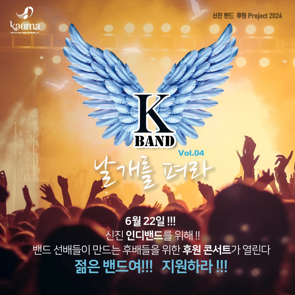 한국 록의 본산을 표방하는 대중음악문화진흥협회(Kaoma. 이사장 주용원,이하 음진협)가 신진밴드 후원 프로젝트] [’2024 K-밴드 날개를 펴라’] 를 개최한다.
