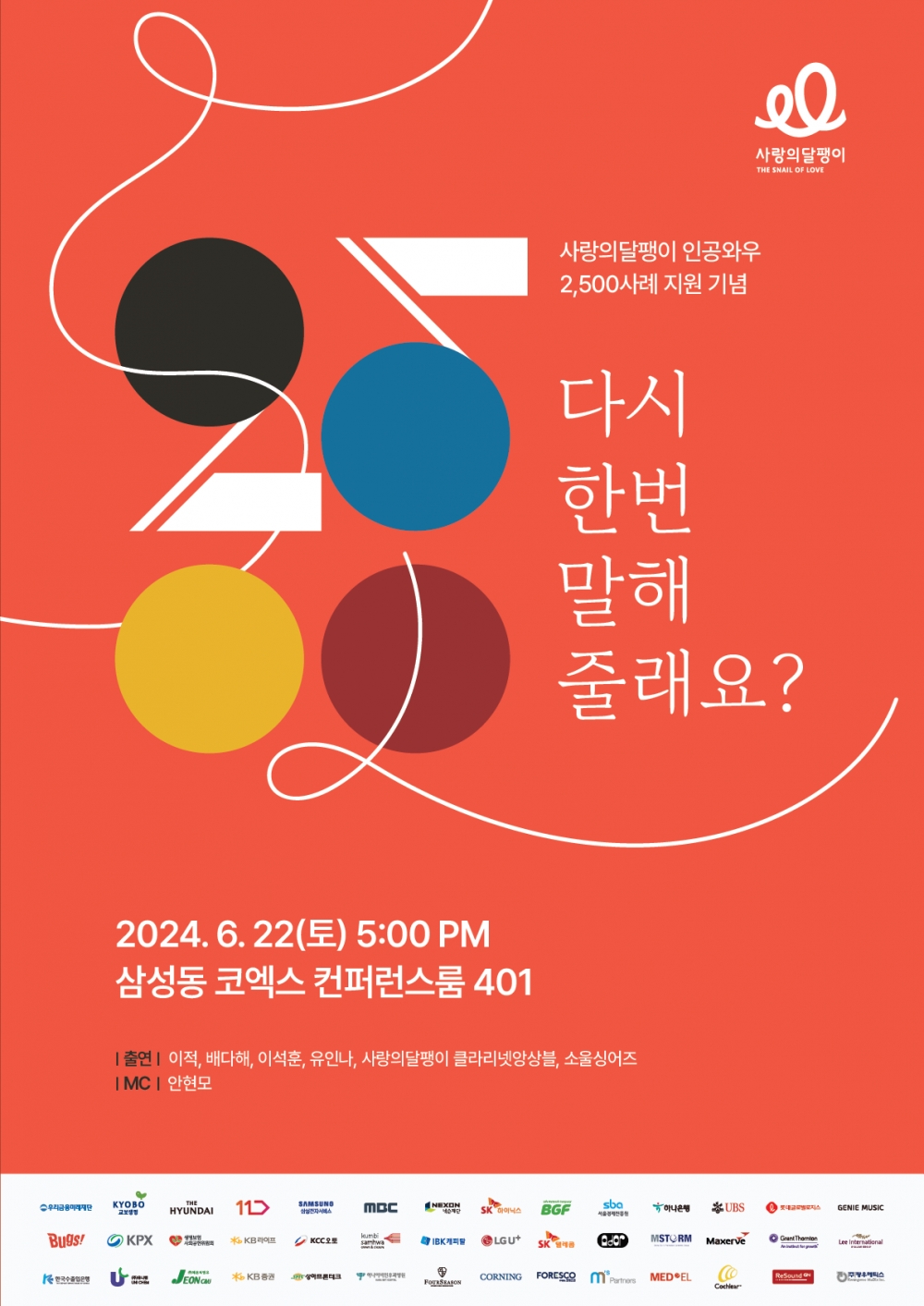 사랑의달팽이는 인공와우와 관련한 지원 정책에 변화의 목소리를 전달하고자 청각장애인들이 자주 듣는 말인 ‘다시 한번 말해 줄래요?’를 콘셉트로 오는 6월 22일 토요일 삼성동 코엑스 컨퍼런스 홀에서 동명의 행사를 개최한다.