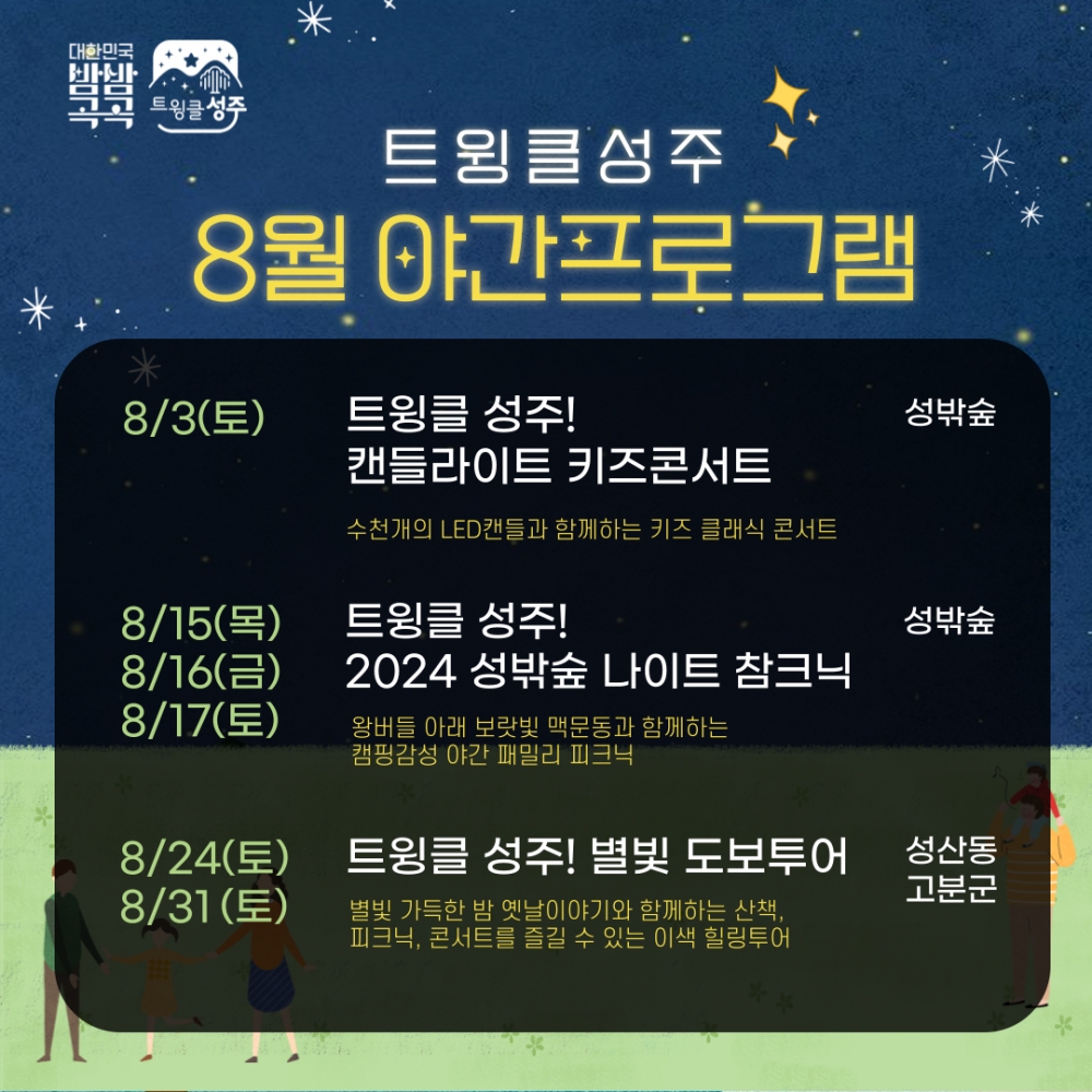 ‘트윙클 성주’ 야간관광 콘텐츠에 대한 자세한 정보는 야간관광 공식 SNS(인스타그램 @twinkle_seongju)에서 확인할 수 있으며, 9월에도 다채로운 야간관광 프로그램(트윙클 성주! 성밖숲 나이트워킹 등)을 선보일 예정이다.