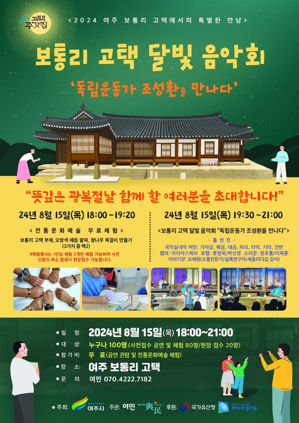 ‘2024 여주 보통리 고택에서의 특별한 만남 : 독립운동가 조성환을 만나다’를 주제로 열리는 ‘보통리 고택 달빛음악회’는 국가민속문화유산으로 지정된 독립운동가 청사 조성환 선생의 생가터로 알려진 여주 보통리 고택에서 진행되며, 가야금과 해금, 대금, 피리, 타악, 기타, 건반으로 구성된 국악실내악 여민을 비롯해 래퍼 아이삭스쿼브, 보컬 류영욱과 박신영, 소리꾼 정초롱과 이재훈, 이야기꾼 오채원 등이 출연할 예정이다.