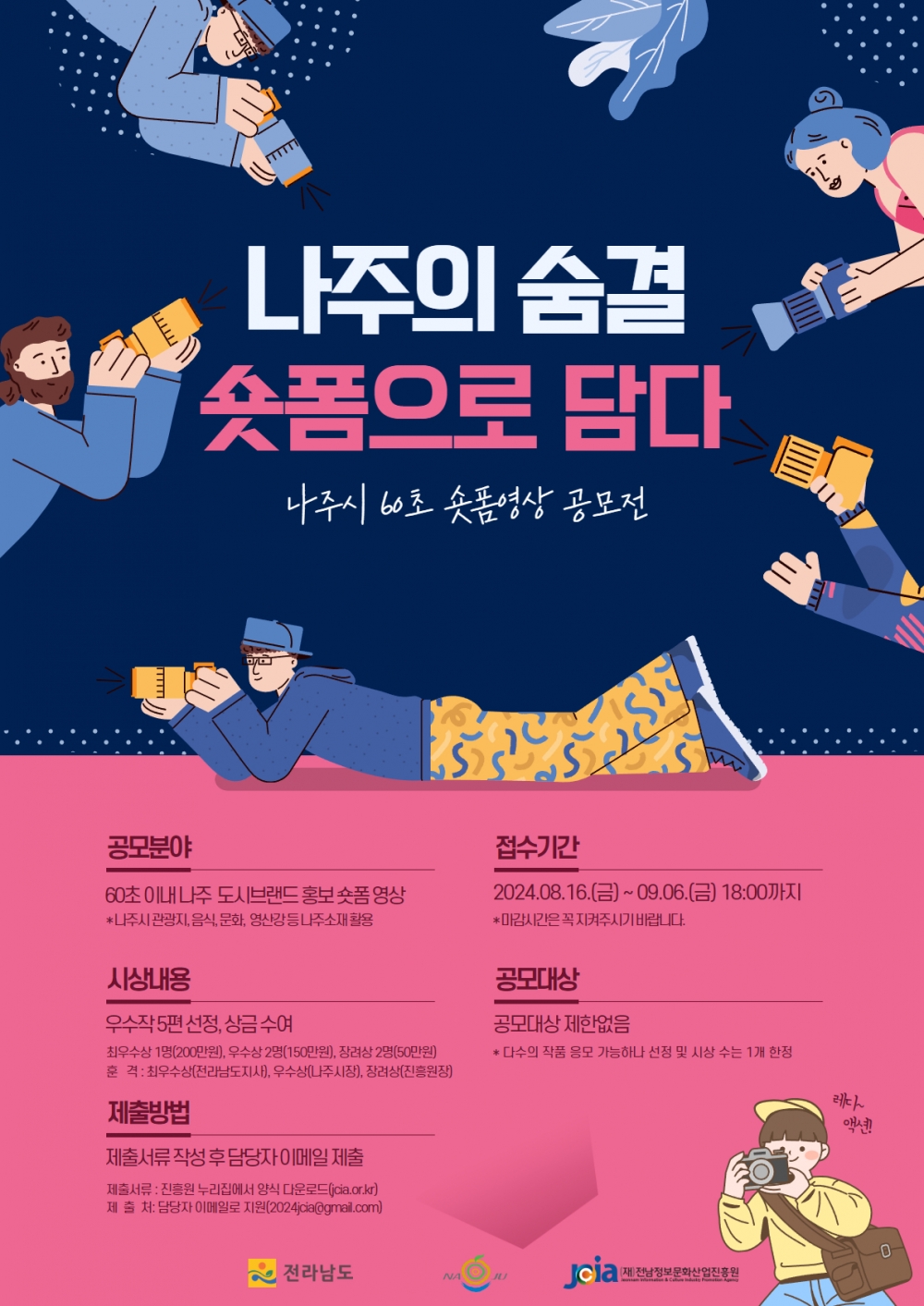 공모전은 8월 16일(금)부터 9월 6일(금)까지 진행되며 나주시에 관심있는 누구나 참여 가능하다. 응모작은 가로 1080 × 세로 1920p FHD 이상 (9:16, 세로형), 30~60초 영상길이로 제작해야 하며, 참가 희망자는 진흥원 누리집(www.jcia.or.jr)에서 양식을 내려받은 후 제작한 영상 결과물과 함께 담당자 전자우편(2024jcia@gmail.com)으로 제출하면 된다.
