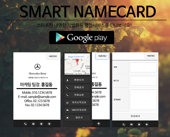 모바일 명함앱은 QR코드나 구글스토어 검색으로 쉽게 모바일 다운로드 받음으로써 전화 바로 걸기 기능, 문자 발송 기능, 현 위치 확인 기능, 카카오톡 발송 기능, 상담요청 기능, 홈페이지 바로 가기 기능 등을 통해 고객 편의성을 높였다.