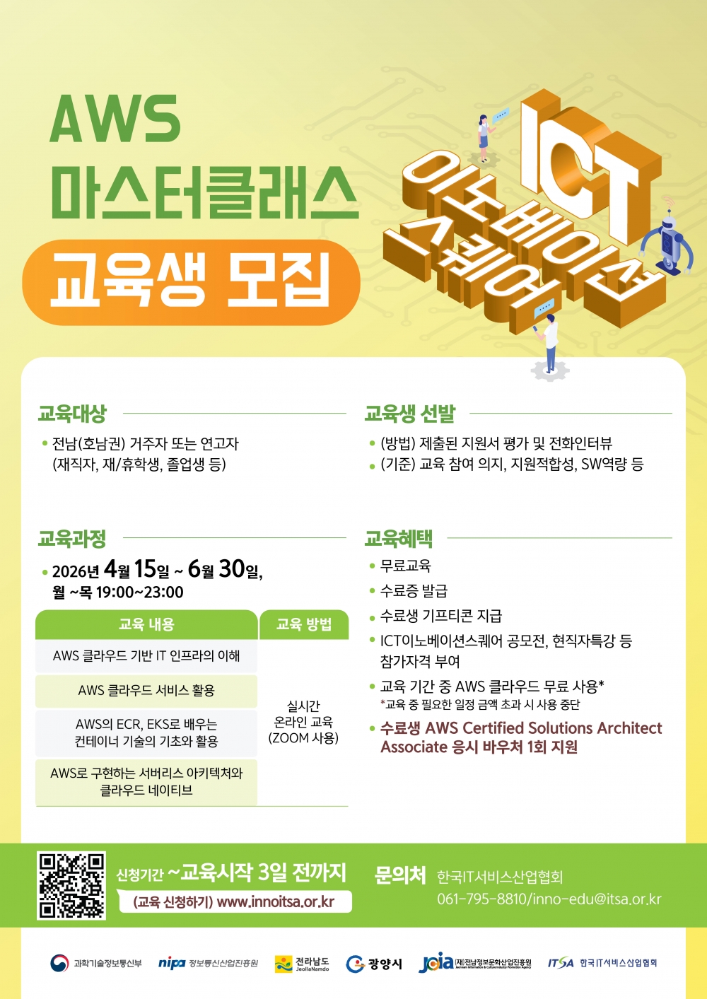 교육 신청은 전남ICT이노베이션스퀘어 홈페이지(www.innoitsa.or.kr)를 통해 4월 10일까지 가능하며, 정원은 25명 내외로 선착순 마감될 예정이다. 자세한 내용은 전남ICT이노베이션스퀘어 담당자(061-795-8810)를 통해 문의할 수 있다.