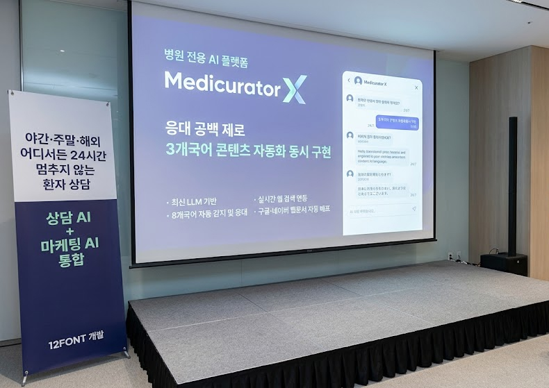 12폰트는 병원 전용 AI 플랫폼 '메디큐레이터 엑스(Medicurator X)'를 공식 출시했다. 메디큐레이터 엑스는 크게 두 개의 독립 시스템으로 구성된다. 첫째, 실시간 웹 검색과 최신 대형언어모델(LLM)을 결합한 'AI 상담 시스템'이 365일 24시간 환자 질문에 전문가 수준으로 즉시 답변한다. 둘째, 'AI 마케팅 시스템'이 병원 정보를 한국어•영어•일본어 3개국어로 매일 자동 작성해 구글과 네이버에 자동 배포함으로써 SEO 자산을 지속 누적한다.
