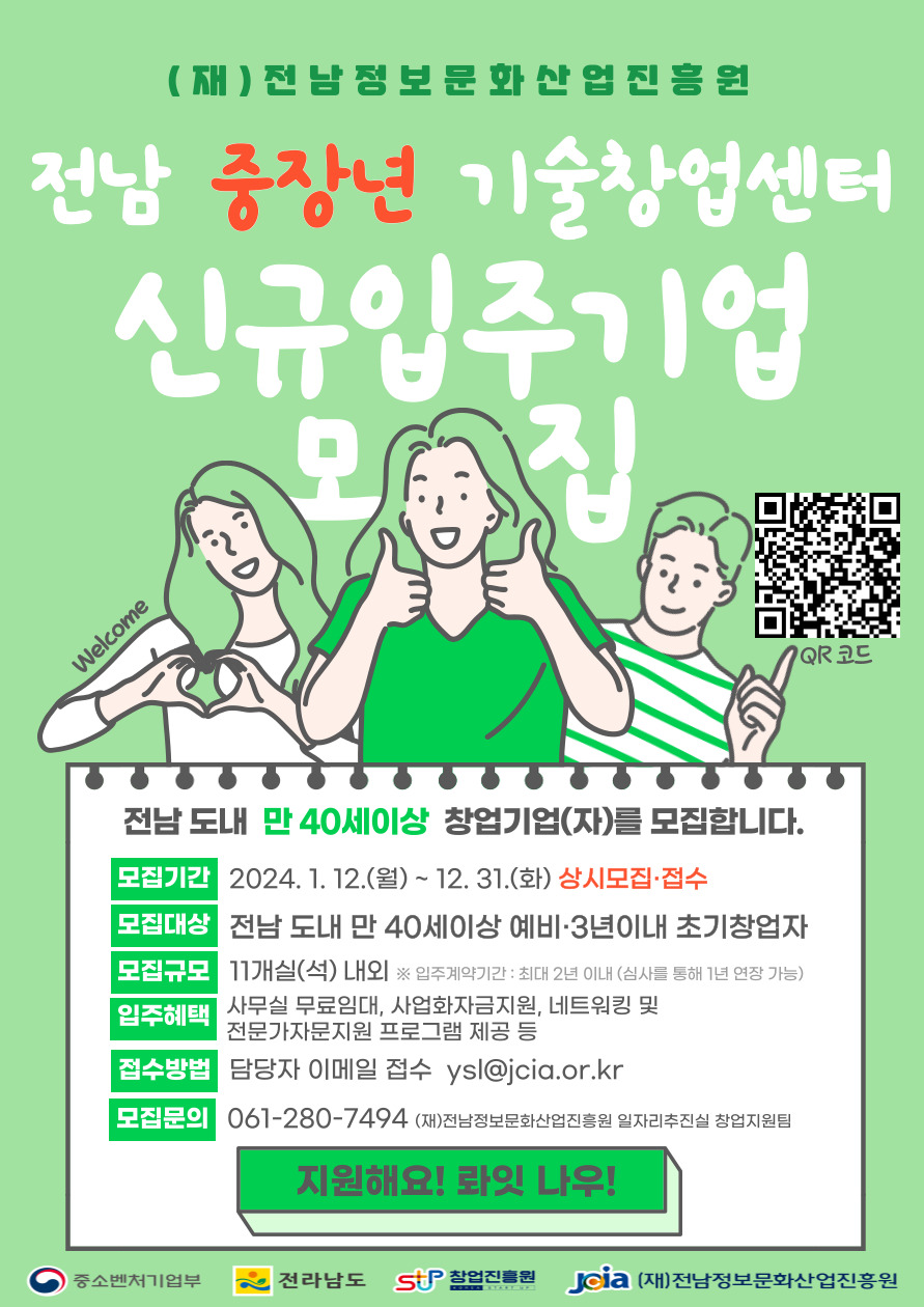 (재)전남정보문화산업진흥원(원장 이인용, 이하 ‘진흥원’)‘전남 중장년 기술창업센터(이하, 센터)’가 2024년 신규 입주기업을 상시 모집한다고 밝혔다.