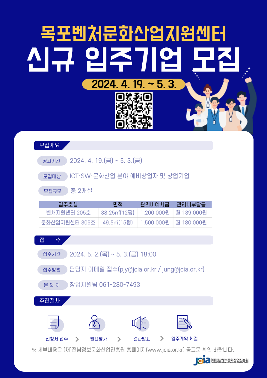 (재)전남정보문화산업진흥원(원장 이인용)에서 5월 3일까지 ‘목포벤처‧문화산업지원센터’ 신규 입주기업을 모집한다고 24일 밝혔다.