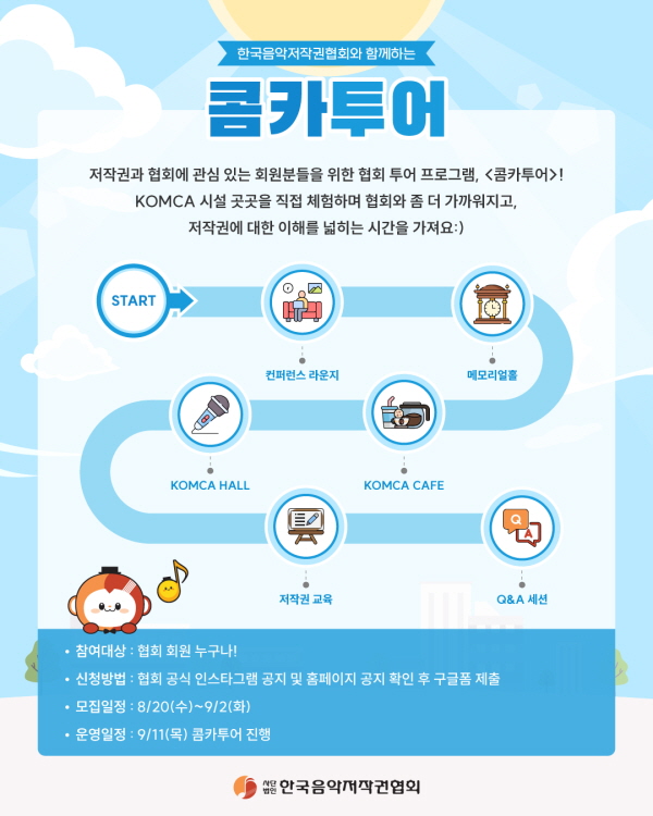 사단법인 한국음악저작권협회(회장 추가열, 이하 음저협)가 회원과 더 가까이 소통하기 위한 특별 프로그램 “콤카투어(KOMCA TOUR)”를 오는 9월 11일(목) 처음 선보인다.