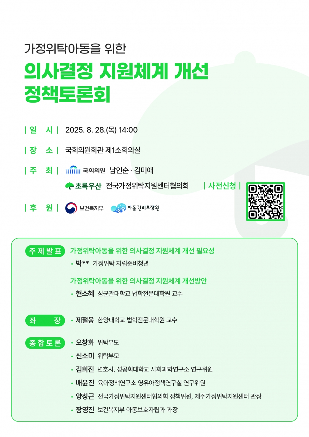 ‘가정위탁아동을 위한 의사결정 지원체계 개선 정책토론회’는 초록우산과 더불어민주당 남인순 의원, 국민의힘 김미애 의원, 전국가정위탁지원센터협의회가 공동 주최한다.