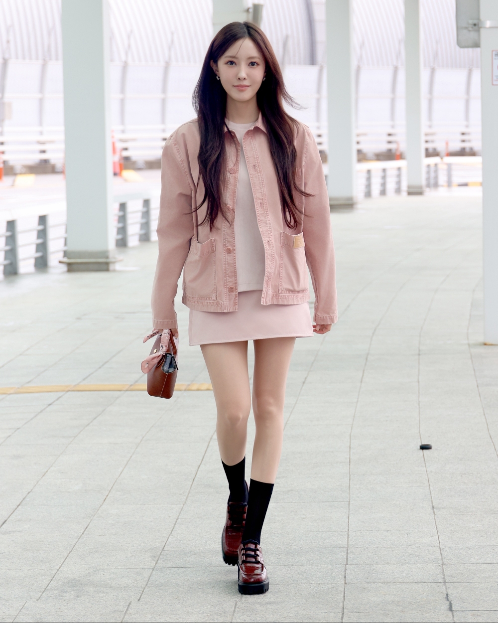 이날 효민은 핑크 컬러 새틴 스커트에 스트레이트 핏 코튼 자켓을 톤온톤으로 매치하고, 핑크& 브라운 컬러가 조화로운 컴팩트한 미니백을 더한 가을 공항패션을 선보였다.