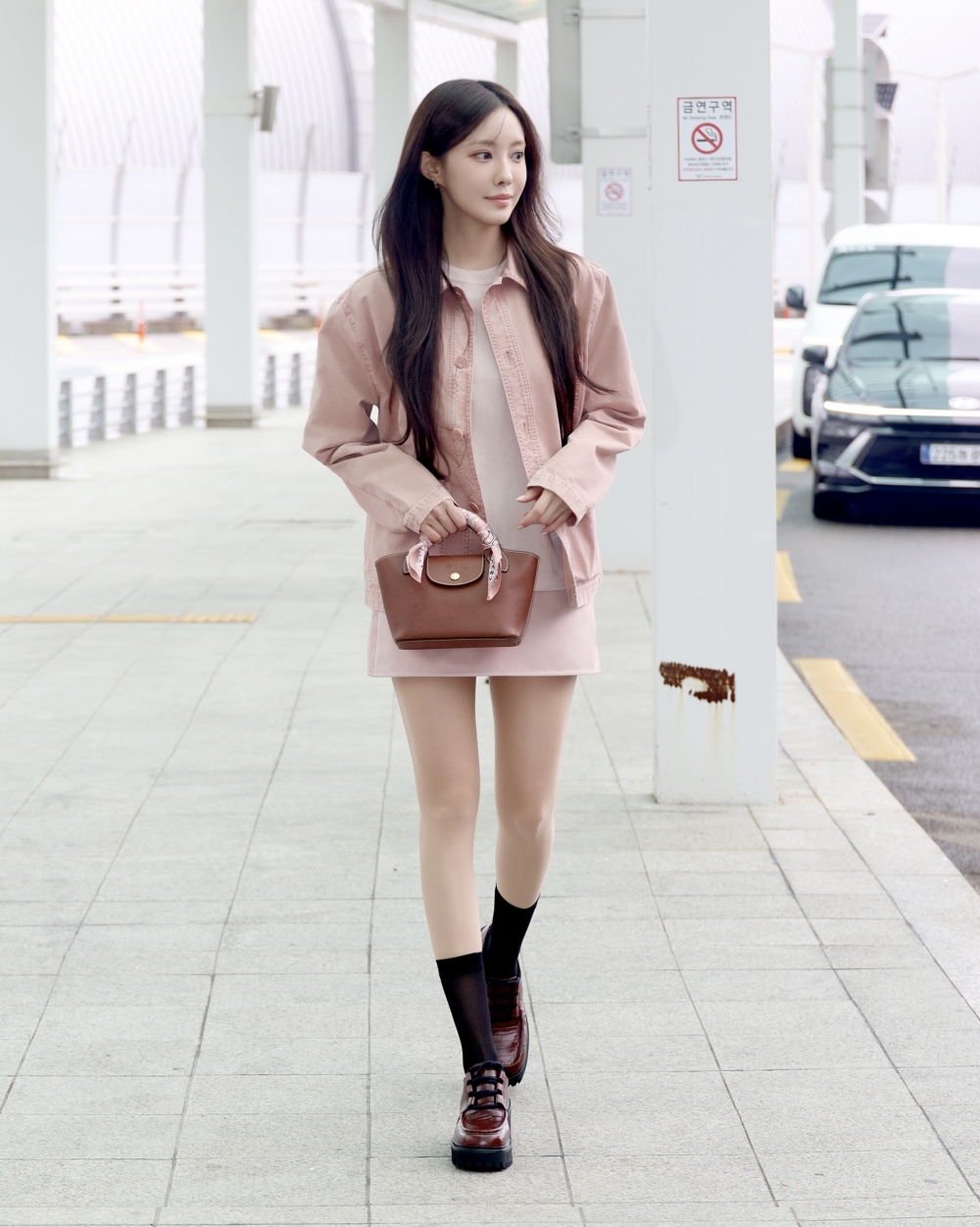 이외에도 핑크 컬러의 자켓과 스커트, 브라운 컬러가 돋보이는 더비 슈즈, 스카프까지 전부 롱샴 제품으로 알려지며, 완성도 높은 공항패션 스타일링을 통해 연예계 대표 패셔니스타의 면모를 가감없이 보여주었다.