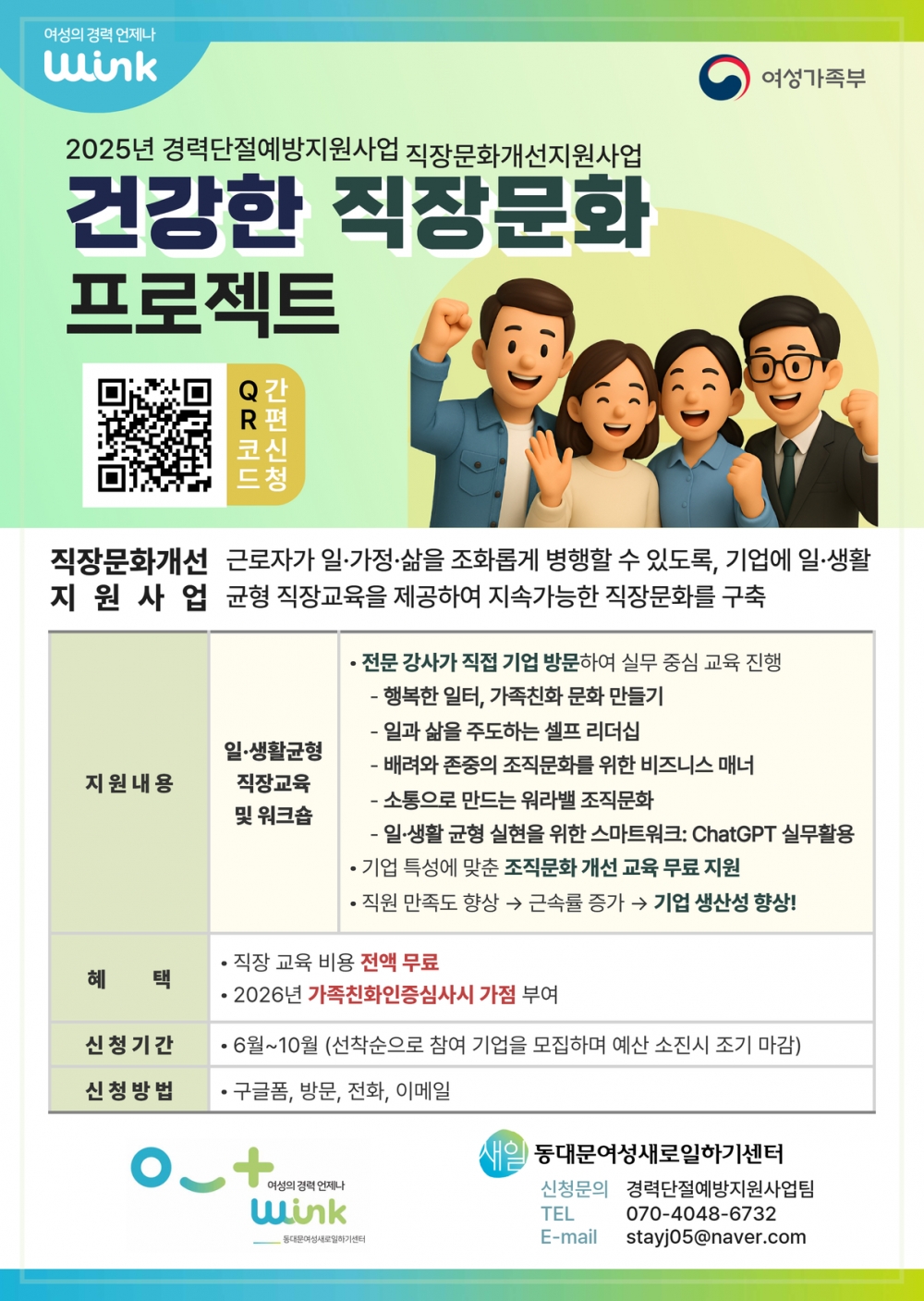 동대문새일센터 하선임 부장은 “근로자의 만족도와 성장은 곧 기업 경쟁력으로 이어진다”며, “이번 교육이 워라밸 문화 확산과 가족친화적 직장문화 정착에 실질적인 도움이 되길 바란다”고 전했다.