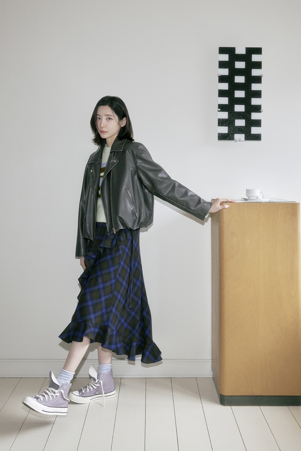 박지현은 체크 패턴 오간자 소재의 블라우스와 클래식한 브라운 자켓으로 가을의 정석 코디를 완성하는가 하면 부드럽게 떨어지는 페이크 레더 자켓과 언발란스한 기장과 프릴 디테일이 돋보이는 블루 체크 스커트를 착용해 캐주얼과 페미닌 사이를 넘나드는 스타일을 완벽 소화했다.