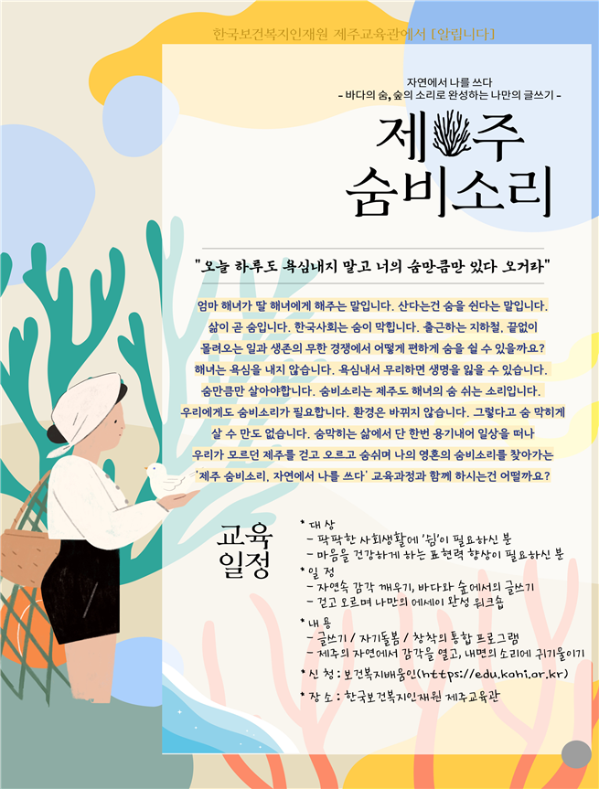 한국보건복지인재원(원장 배금주, 이하 인재원)은 오는 10월 29일부터 31일까지 제주교육관에서 보건복지 분야 공무원 및 공공기관 직원을 대상으로 건강한 공직사회를 위한 최초의 자연 기반 치유형 글쓰기 교육과정인 ‘2025년 제주 숨비소리과정(자연에서 나를 쓰다)’을 시범 운영한다고 밝혔다.