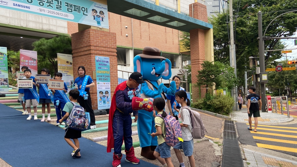 오늘(9/12) 오전 서울신길초등학교 정·후문 일대에서 ‘동작구청(부구청장 권순기)·서울동작경찰서(서장 정석화)·서울특별시동작관악교육지원청(교육장 강순원)·삼성전기(그룹장 최우철)·서울신길초등학교(교장 최낙준)·푸른나무재단(사무총장 최선희)’이 함께 아이들의 안전한 등굣길과 학교생활을 위해 ‘푸른코끼리 등굣길 캠페인’을 진행했다.
