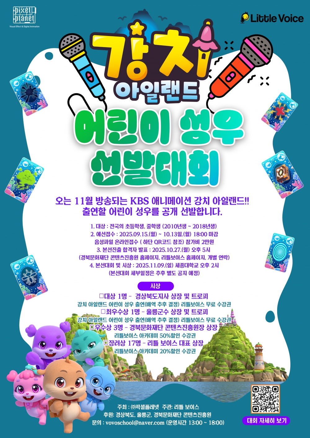 특히 대상(경상북도지사상)과 최우수상(울릉군수상) 수상자에게는 ‘강치아일랜드’ 시즌2 성우로 참여할 기회가 주어지게 된다.