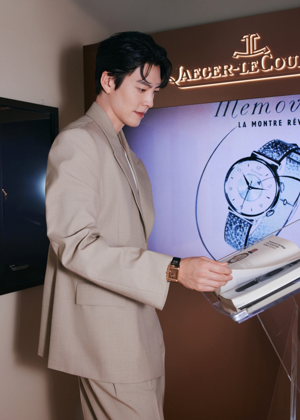 공개된 사진 속 김우빈은 9월 9일 상하이 장위안에서 막을 올린 스위스 파인 워치메이킹 메종 예거 르쿨트르(Jaeger-LeCoultre)의 ‘Dream Shaper’ 전시 개막식에 참석한 모습으로, 모던한 베이지 컬러의 수트를 착용해 클래식함의 정수를 보여주었다. 여기에 우아한 실루엣이 돋보이는 예거 르쿨트르의 ‘리베르소 트리뷰트 크로노그래프(Reverso Tribute Chronograph)’를 매치해 세련미를 더해주었다.