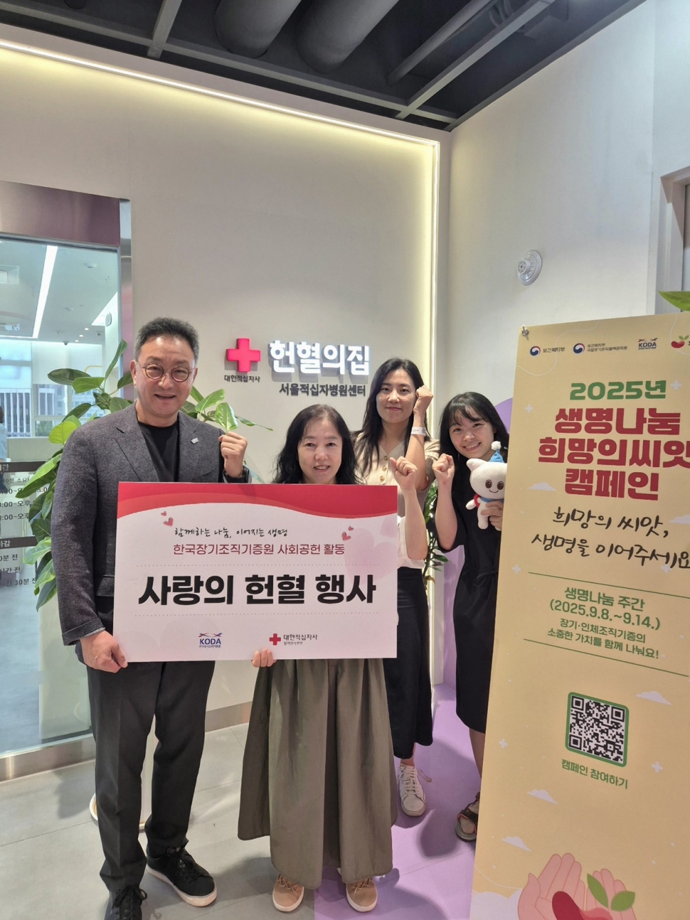 이번 행사에는 서울 본사를 비롯해 전국 지소 임직원 30여명이 헌혈에 동참했으며, 헌혈증을 한국조혈모세포은행협회에 전달할 예정이다. 한국장기조직기증원은 이 활동을 통해 혈액 질환 환우들에게 희망을 전하고, 생명나눔 가치 확산에 앞장서고 있다.