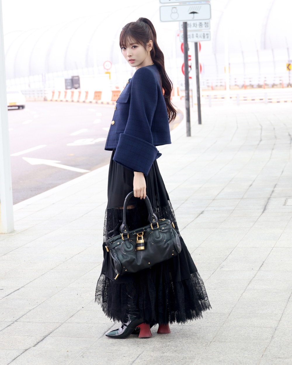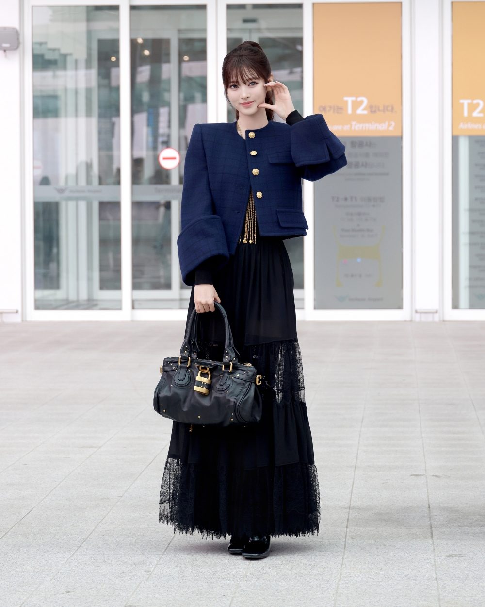 이날 미야오 안나는 인형 같은 비주얼과 독보적인 아우라로 공항을 밝히며 시선을 사로잡았다. 고급스러운 체크 패턴 울 재킷과 페미닌한 실루엣의 레이스 롱 스커트에 태슬 네크리스를 매치해 세련된 무드를 연출하고, 자물쇠 장식이 돋보이는 모던한 블랙 레더 패딩턴 백과 페이턴트 롱 부츠로 감각적인 포인트를 더해 프렌치 시크룩을 완성했다.