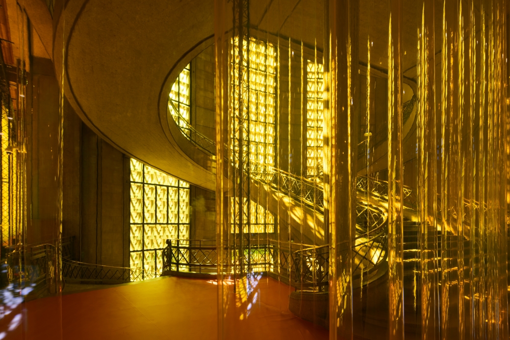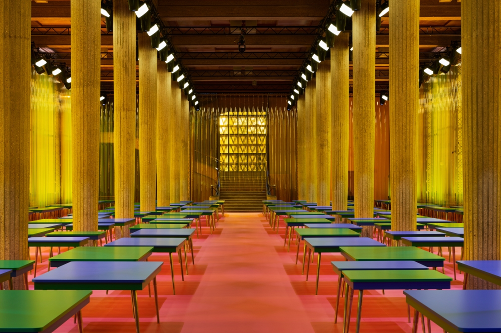 이번 쇼의 무대 연출은 팔레 디에나(Palais d’Iéna)의 기둥이 늘어선 공간을 일상의 가정적 공간으로 추상화하며, 서로 다른 색조의 포르미카 테이블이 리드미컬하게 배치되어 공간을 구성했다.