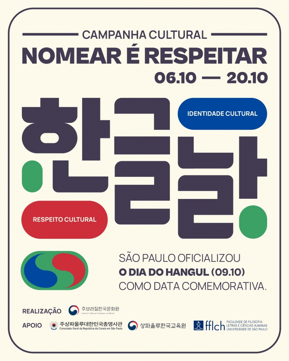 주브라질한국문화원(원장 김철홍)은 브라질 상파울루주가 2025년 처음으로 한글날(10월 9일)을 공식 기념일로 지정한 것을 맞아 ‘이름을 올바르게 부르는 것이 곧 존중입니다(Nomear é respeitar)’ 캠페인을 전개한다.