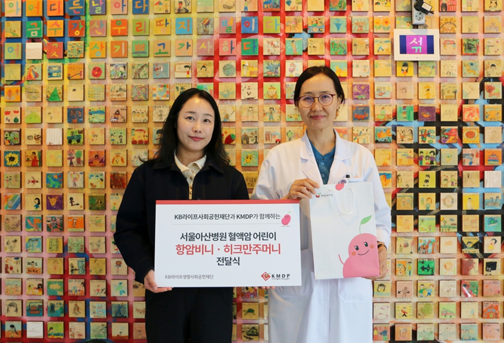 한국조혈모세포은행협회(KMDP, 회장 이홍기)는 21일, KB라이프생명사회공헌재단과 함께 서울아산병원 혈액암 환아들에게 항암비니와 히크만 주머니를 전달했다고 밝혔다.
