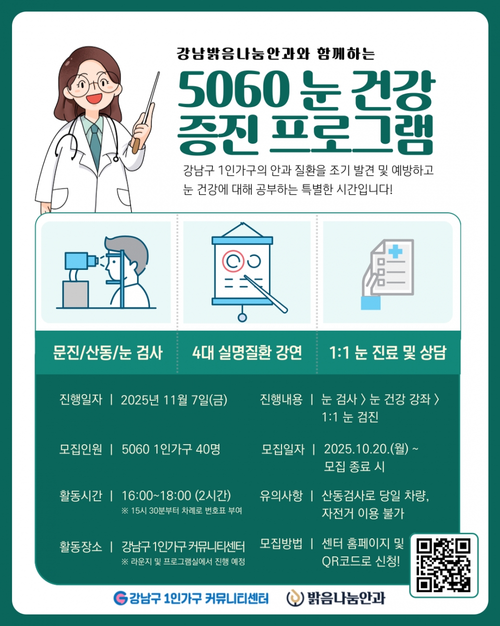 강남구 1인가구 커뮤니티센터(센터장 김기연)가 강남밝음나눔안과와 함께 11월 7일 ‘5060 눈 건강 증진 프로그램’을 진행한다고 밝혔다.