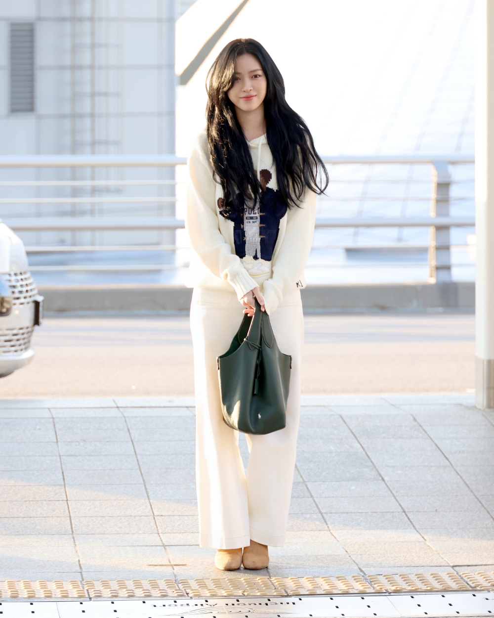 류진은 이날 출국길에서 귀여우면서도 포근한 스타일의 공항패션을 선보이며 눈길을 끌었다.
