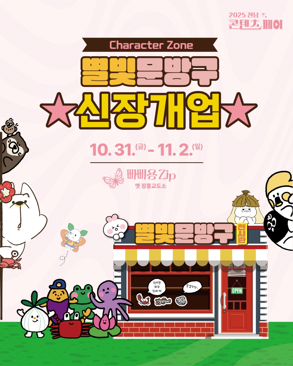 캐릭터존 전시는 진흥원이 운영하는 전남콘텐츠코리아랩의 대표 캐릭터 2종과, ‘전라남도 이모티콘 공모전’을 통해 선정된 이모티콘 수상작 4종을 함께 선보이며, 전라남도의 문화·자연·지역 정체성을 담은 창작 IP(지식재산) 를 전시와 체험을 통해 시민들에게 소개하는 자리다. 전시 공간은 ‘문방구’를 콘셉트로 꾸며져 관람객이 친근하게 캐릭터를 접할 수 있도록 구성되었다.