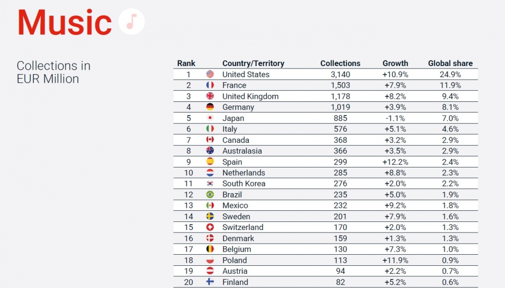 전 세계 음악 저작권료 순위에서 한국은 미국과 유럽의 강세 속에서도 11위를 기록하며 한류 강국의 저력을 입증했다. 보고서에 따르면 한국의 음악 저작권 징수액은 OTT와 주문형 스트리밍 서비스를 포함한 디지털(전송) 부문과 공연(라이브·백그라운드) 부문의 사용료가 전년 대비 완만한 상승세를 보이며, 전반적인 안정세를 유지한 것으로 나타났다. 2024년 디지털 부문 수입은 전년 대비 12.2% 증가해 전체 징수액의 48.1%를 차지했으며, 공연 부문은 콘서트 재개 등의 영향으로 3.6% 소폭 증가했다.