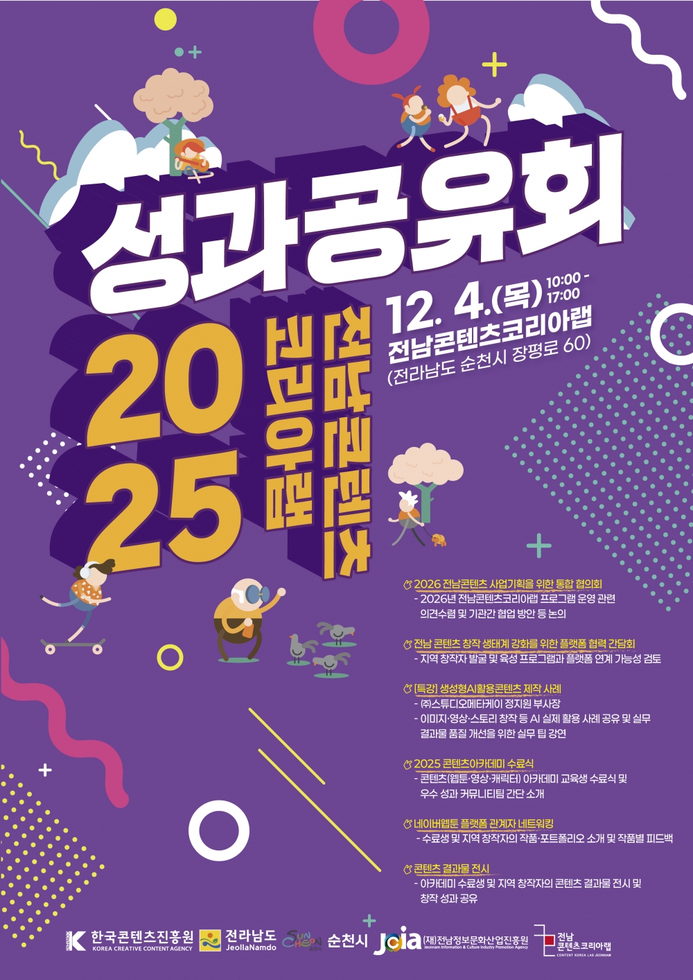 전남정보문화산업진흥원(원장 이인용, 이하 진흥원)은 4일 도내 콘텐츠 창작자들과 함께 『2025 전남콘텐츠코리아랩 성과공유회』를 개최하고, 올해 아카데미 프로그램 운영 성과와 지역 창작자들의 결과물을 공유하는 자리를 성공적으로 마무리했다고 밝혔다.