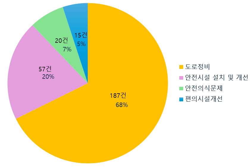 유형별로는 도로 정비 요청이 약 68%로 가장 많았고, 안전시설 설치 및 개선 요구가 20%를 차지했다. 이와 함께 자전거도로 흡연, 불법 주정차 및 불법 투기, 개인 소유물 무단 적치 등 시민의식과 자전거 이용 문화와 관련된 문제도 다수 확인됐다.