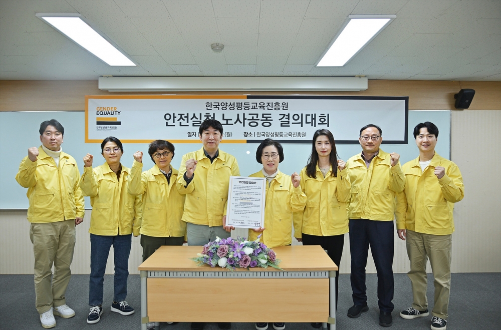 ▲양평원 노사 대표 구성원이 함께 모여 안전실천 결의를 다지며 기념촬영을 하고 있다. (출처: 한국양성평등교육진흥원)