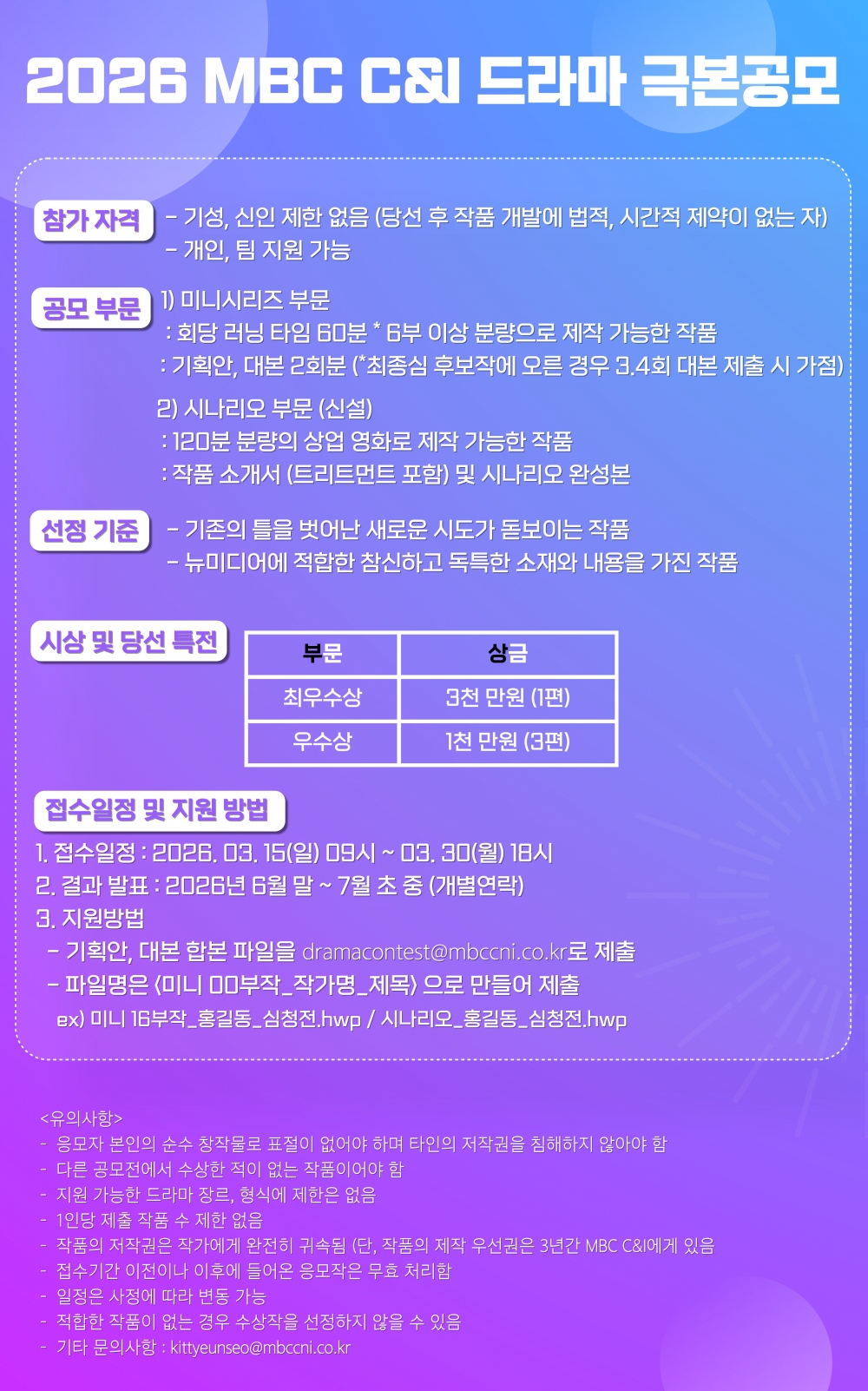 미니시리즈 부문은 기획안과 대본 2회분 이상, 시나리오 부문은 작품 소개서(트리트먼트 포함)와 시나리오 완성본을 대표 메일 (dramacontest@mbccni.co.kr )로 제출하면 된다.