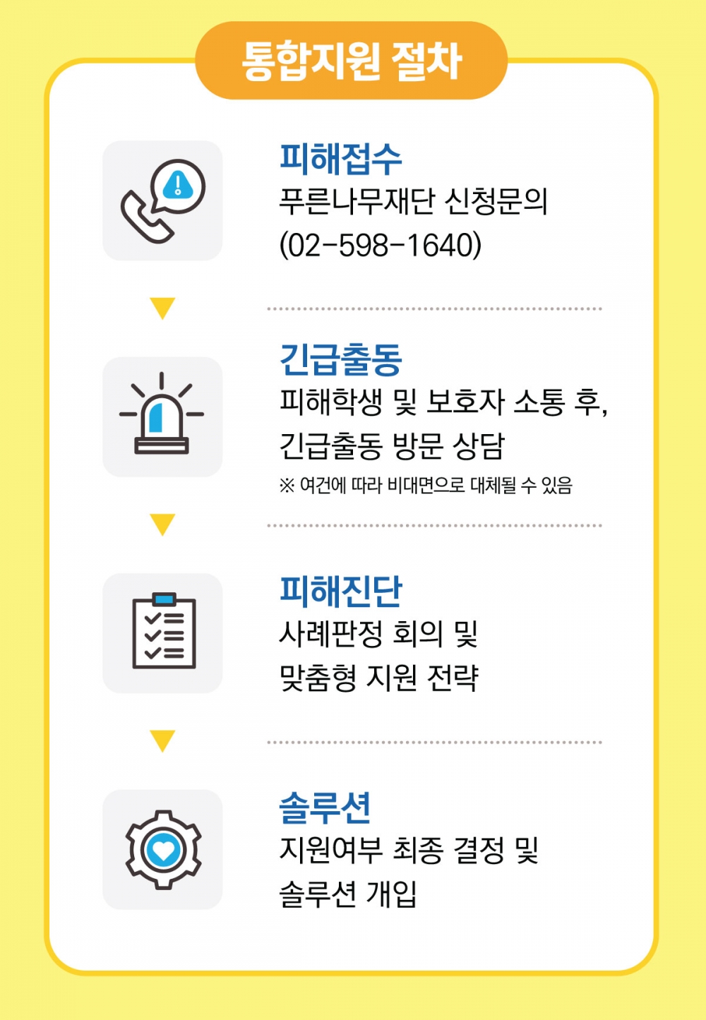 학교폭력 피해로 어려움을 겪는 청소년 및 가정은 BTF푸른나무재단(1588-9128, www.btf.or.kr)을 통해 관련 상담 및 지원 절차에 대해 안내받을 수 있다.