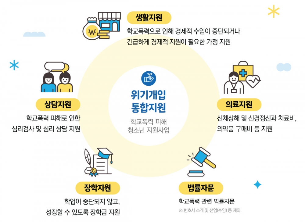 이 사업은 학교폭력 사안 발생 시, 전국 학교폭력 상담전화(1588-9128)를 비롯해 전국 17개 시·도 교육(지원)청, 학교, 경찰서·경찰청, 청소년상담복지센터, 지자체(주민센터·복지관 등) 등과 긴밀히 연계하여 운영된다. 전문상담사가 현장에 긴급 출동하여 학생과 보호자를 대상으로 위기개입을 실시하고, 이후 사례판정 회의를 통해 △심리검사 및 심리상담 지원 △신체?상해 및 신경정신과 진료?치료 지원 △장학지원 △학교폭력 법률상담 △생활지원 등 맞춤형 통합지원을 실시한다. 사안 발생부터 회복까지 전 과정을 원스톱으로 지원하는 것이 특징이다.