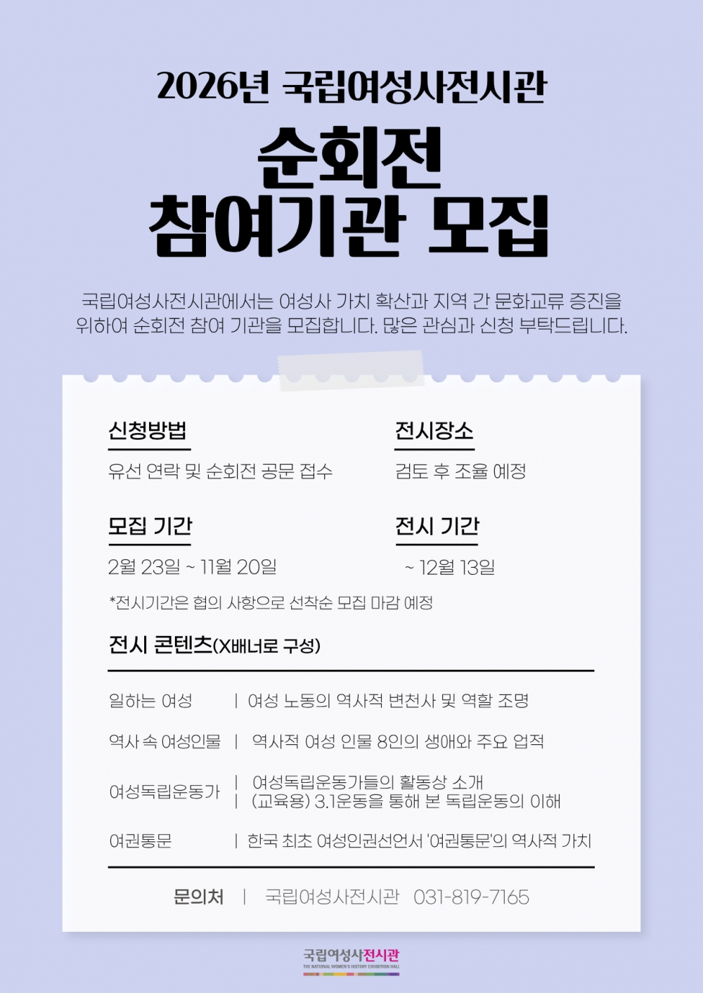성평등가족부 산하 한국양성평등교육진흥원 국립여성사전시관(이하 여성사전시관)은 2월 23일(월)부터 11월 20일(금)까지 ‘2026년 국립여성사전시관 순회전’ 참여기관을 모집한다고 밝혔다.