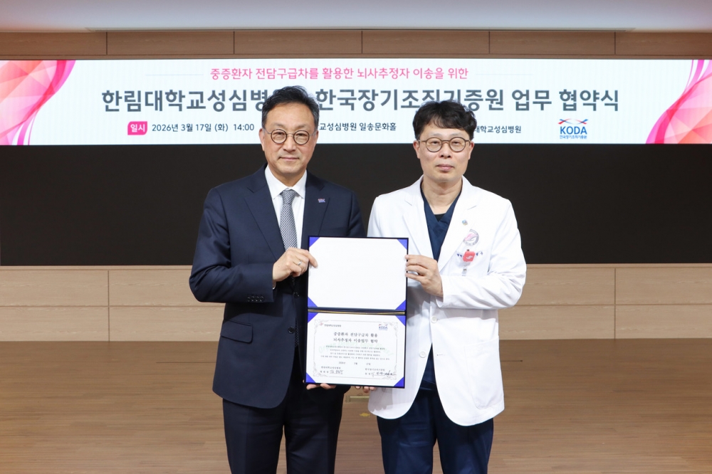 한국장기조직기증원(원장 이삼열)은 한림대학교성심병원(병원장 김형수)과 2026년 3월 17일 제2별관 일송문화홀에서 ‘중증환자 전담구급차 활용 뇌사추정자 이송을 위한 업무협약’을 체결했다.
