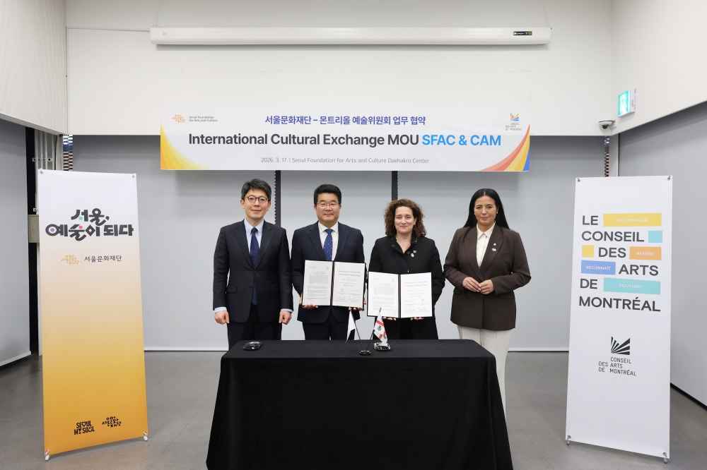 서울문화재단(대표이사 송형종)은 어제(17일) 서울문화재단 대학로센터(종로구 동숭동)에서 몬트리올 문화창조산업 사절단의 서울 방문을 계기로 몬트리올 예술위원회(Conseil des arts de Montréal)와 문화예술 교류 활성화를 위한 업무협약을 체결했다. 이번 협약은 북미 대표 문화예술 도시 몬트리올과의 협력을 통해 서울 예술인의 국제교류 기반을 확대하고 북미 지역과의 문화예술 협력 네트워크를 강화하기 위해 추진됐다.
