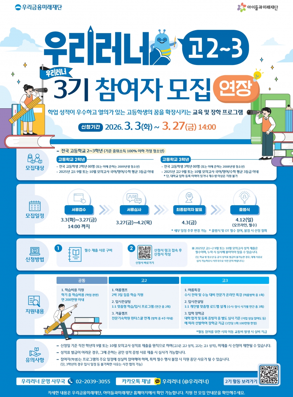 사회복지법인 아이들과미래재단(이사장 이훈규)은 우리금융미래재단(이사장 임종룡)이 주최하고 재단이 주관하는 고등학생 대상 사회공헌 장학사업 ‘우리러너’와 ‘우리미래서울러너’ 3기의 참여 학생 모집 기간을 오는 3월 27일(금) 14시까지 연장한다고 20일 밝혔다.