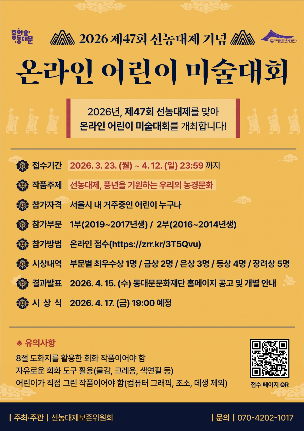 동대문문화재단(이사장 이필형)은 2026년 제47회 선농대제를 기념하여 선농대제보존위원회 주최·주관으로 <2026 제47회 선농대제 기념 온라인 어린이 미술대회>를 개최한다고 밝혔다.