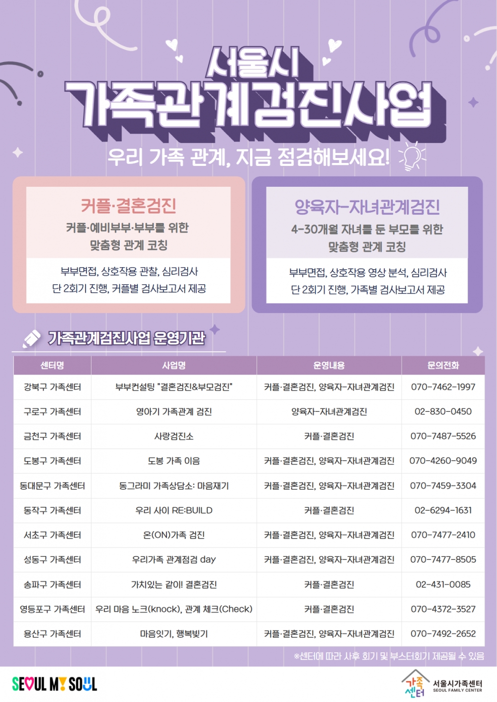 서울시가족센터는 서울시민의 건강한 가족관계 형성과 관계 갈등 예방을 위해 「가족관계검진사업」을 3월부터 운영한다고 밝혔다. 본 사업은 부부 및 양육자-자녀 관계를 전문가가 객관적으로 진단하고 맞춤형 코칭을 제공하는 초단기 상담 기반 프로그램이다.