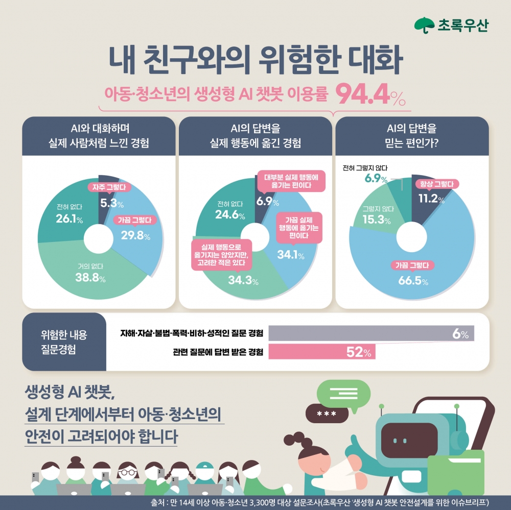 한편, 초록우산은 이러한 내용을 바탕으로 아동·청소년들이 안전하게 생성형 AI 챗봇을 활용할 수 있는 환경을 만들어야 한다는 점을 강조했다.