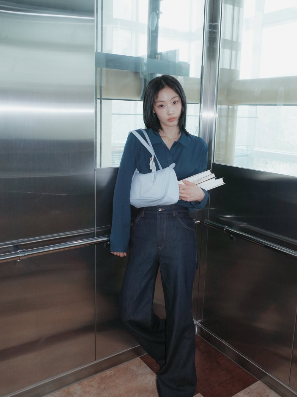 푸른 색 셔츠와 데님 팬츠로 베이직한 톤온톤 아이템 위에 스카이 블루 백으로 포인트를 더하며 미니멀하고 시크한 스타일링으로 눈길을 끌었다.