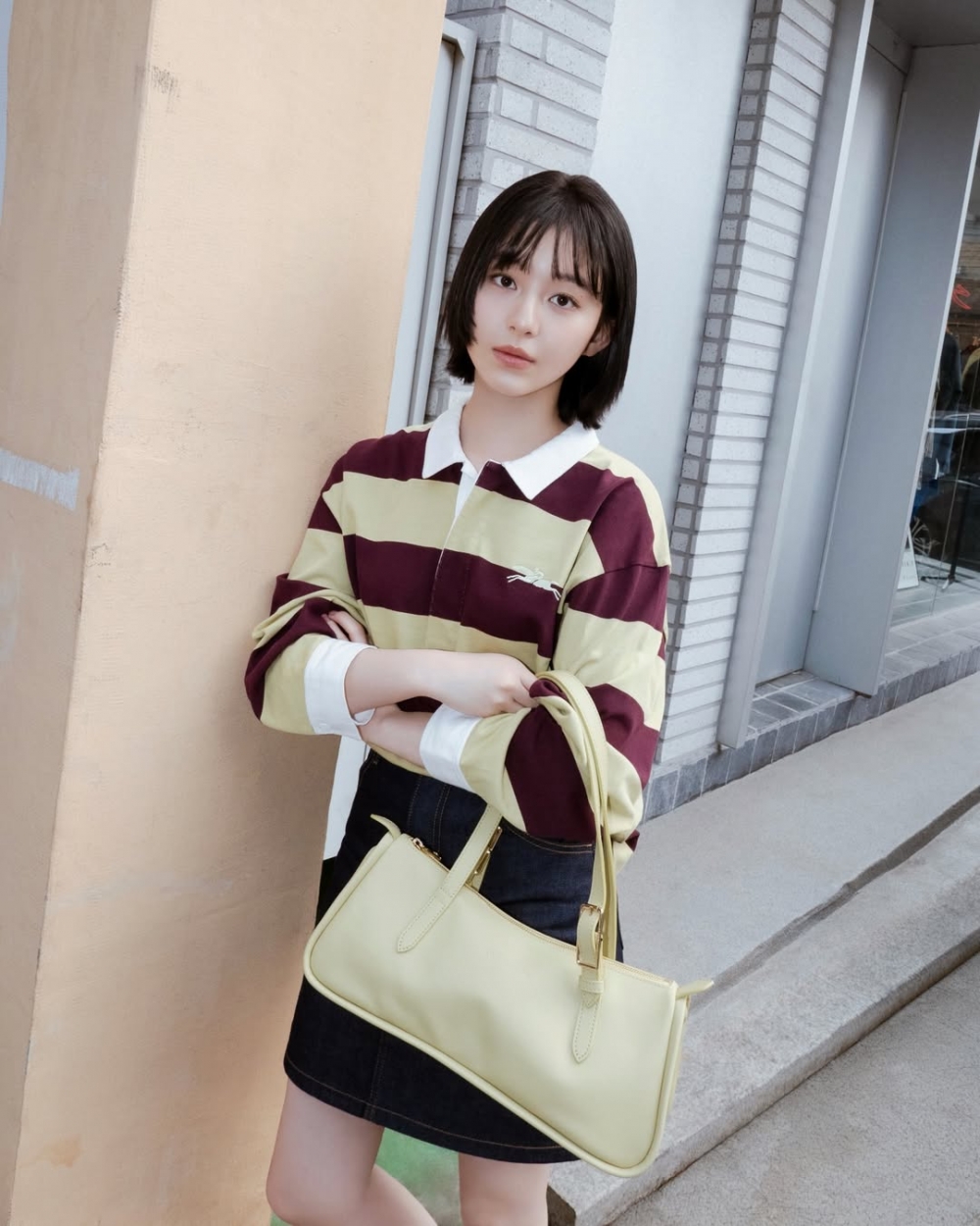 스트라이프 폴로 셔츠와 데님 미니 스커트를 매치한 스타일링에 포인트 백을 더해 경쾌하면서도 세련된 무드를 완성했다.