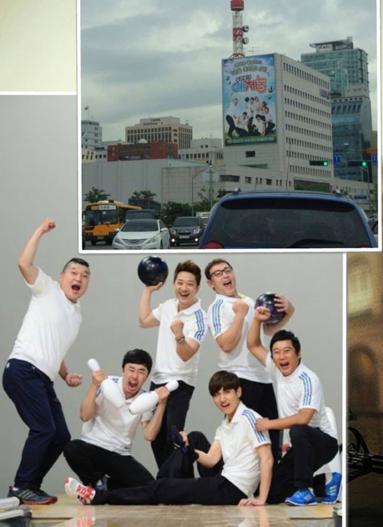'예체능 볼링단의 1승을 축하합니다.'라는 문구가 쓰여진 현수막은 예체능팀이 지난번 치렀던 인천 동춘동 히어로즈와의 볼링 2차전 승리를 축하하는 현수막인 것.