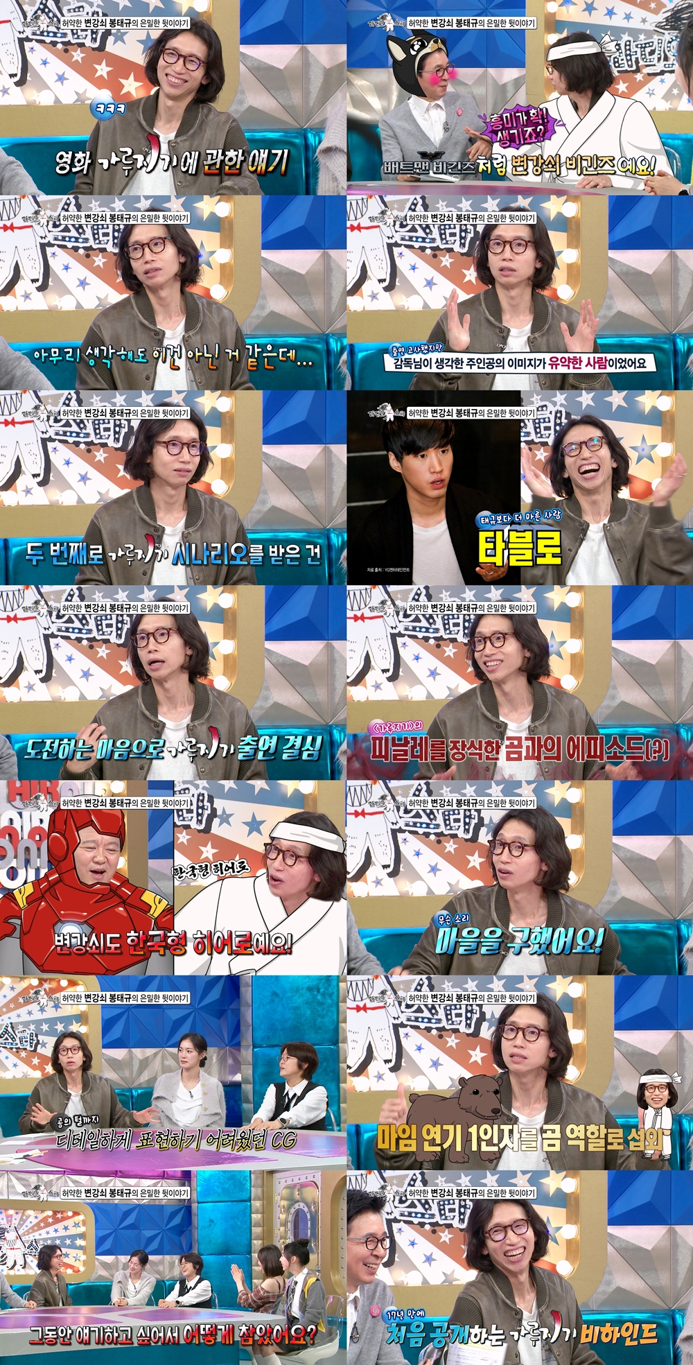 이후 결국 도전하는 마음으로 ‘가루지기’ 출연을 결심한 봉태규는 영화가 완성됐을 때, “관객분들이 흥미롭게 느낄 거라고 생각했다”라면서도 하지만 아쉽게도 “아이언맨이랑 같이 개봉했다”라고 말해 안타까움을 자아냈다. 이때 MC 김구라가 “그거랑 연결 짓지 마세요!”라고 철벽을 치자, 봉태규가 “형! 변강쇠도 한국형 히어로야! 마을을 구했어요!”라고 외쳐 폭소를 자아냈다.